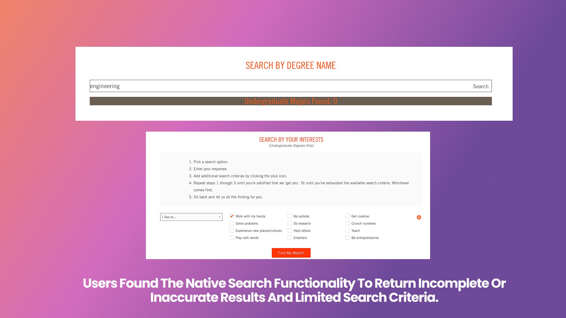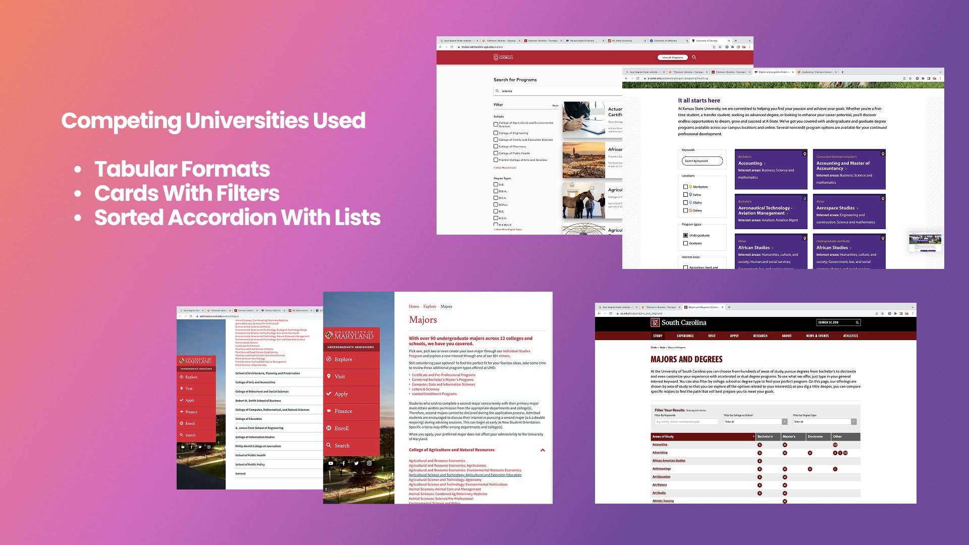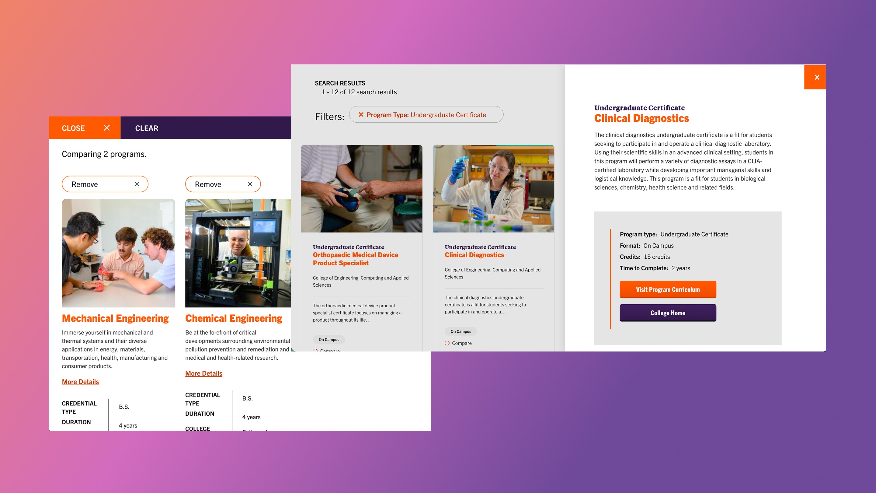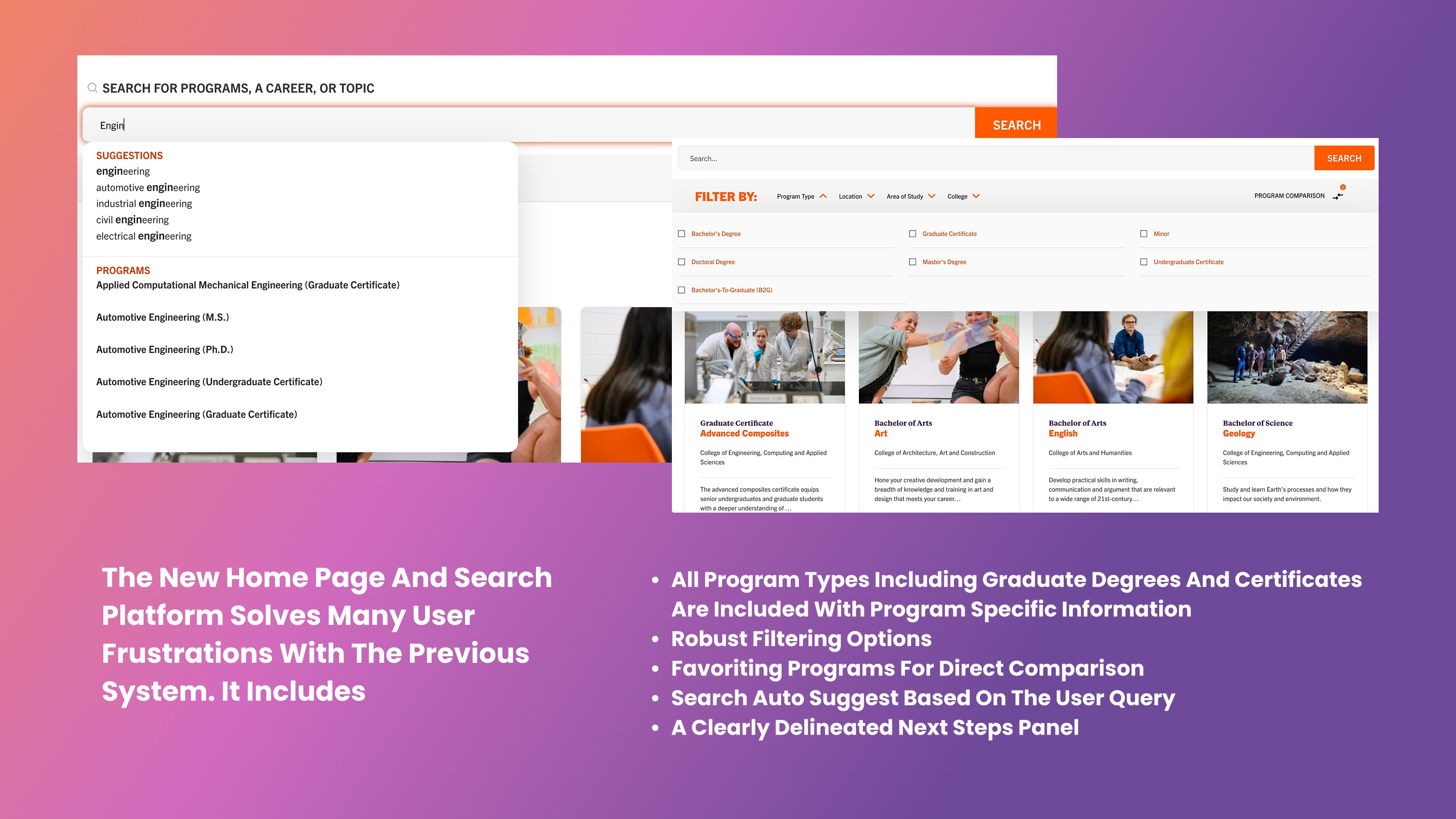 I Compared Degree Search tools from 15 peer institutions and in-state competitors and found a key differentiator that would set us apart would be a robust search tool and aggregation of all programs including certifications and graduate degrees into a single system.