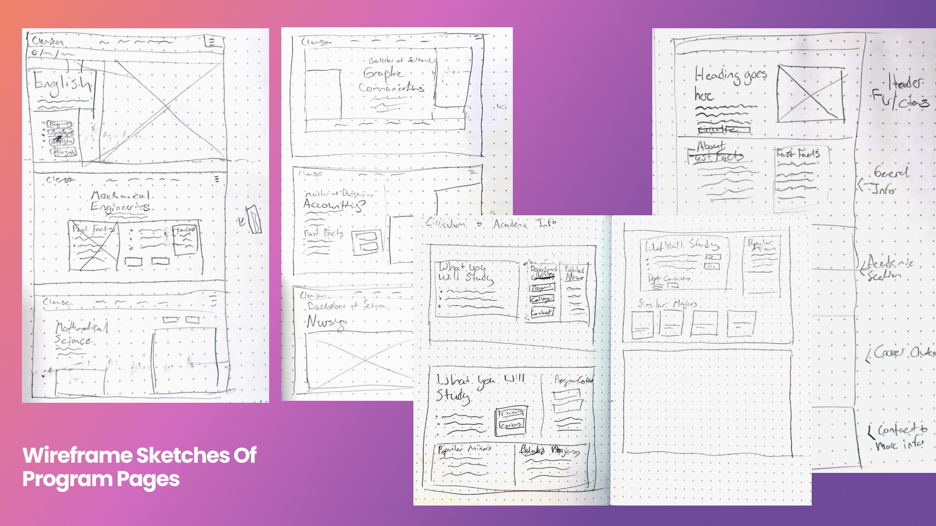 The testing and research was then used to determine the priorities for our layouts in the wireframing stage. Since detailed information about each programs exists on their respective college websites and our the goal for this site was quickly conveying the idea of each program, priority was placed on reducing each program page to the most valuable content to students with clean layouts that are easy to scan. Due there being over 300+ individual programs, the imagery would be limited to illustrations and minimal photography for our small team to be able to maintain.