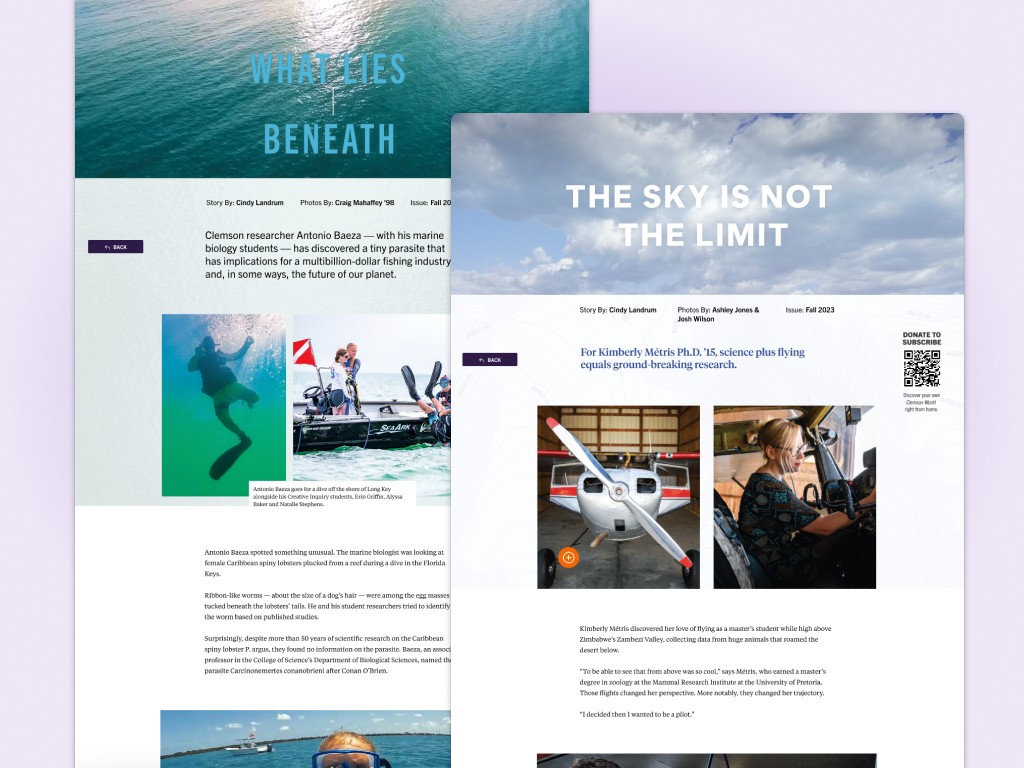 My strategy was to mimic the familiar design of a video streaming platform so users would intuitively know how to use the screen, and then fill each story with elements such as videos, sound, animation, and interactive components to keep them engaged. Each screen then contained a QR code prompting users to subscribe to the magazine or visit its other digital channels, connecting one time visitors stay plugged into future content from ClemsonWorld.