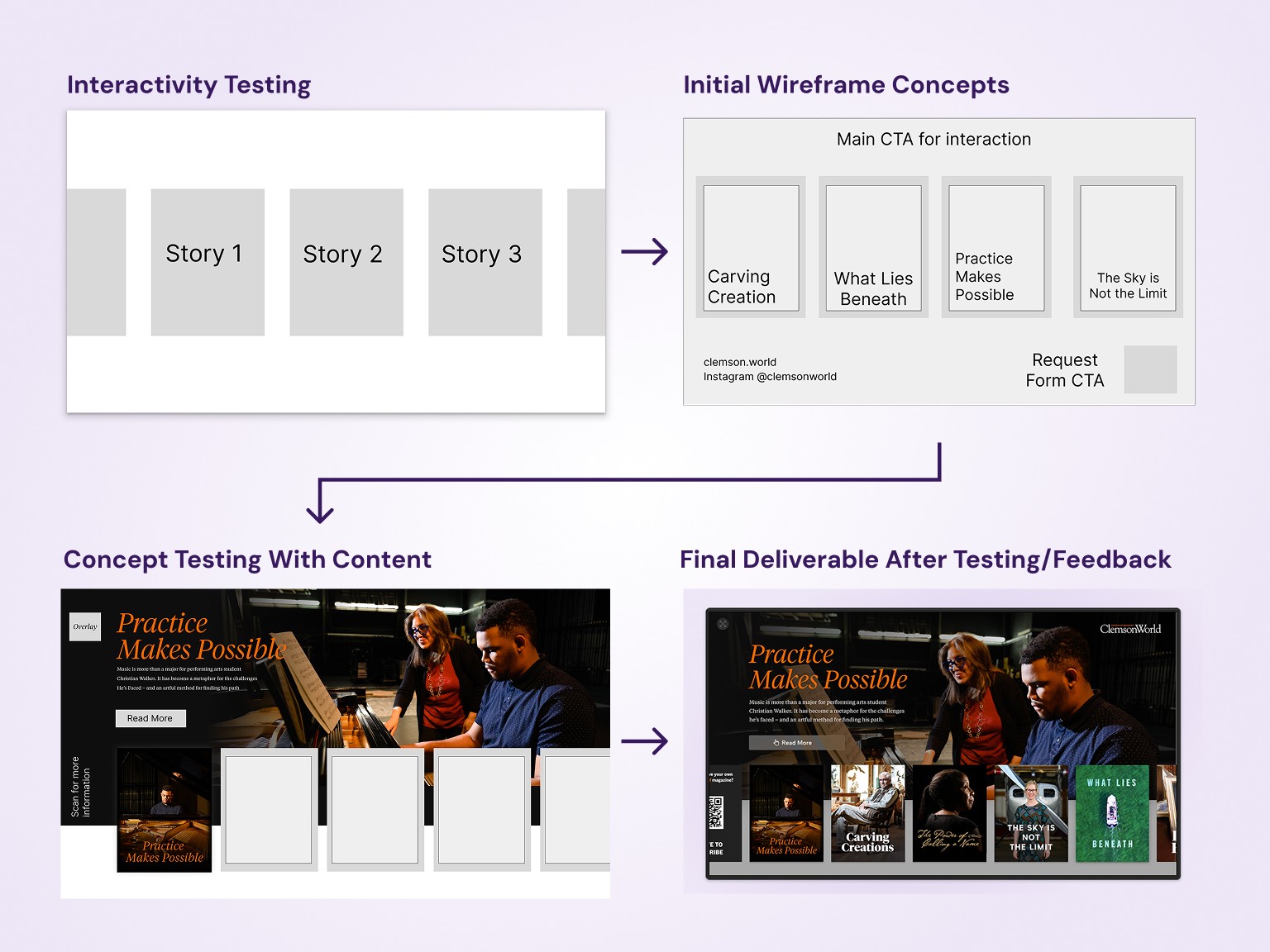 The project revolved around designing and developing a prototype using Figma that would seamlessly mimic an interactive website or app without the need for extensive time developing this for a one off festival exhibit. The ClemsonWorld team and I would tailor the contents of several stories around the needs of the unique environment of a large downtown festival booth.